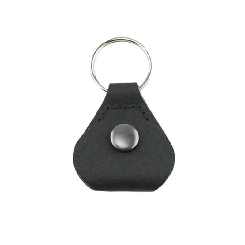 Black leather guitar pick keychain made to protect and hold guitar picks and keys.