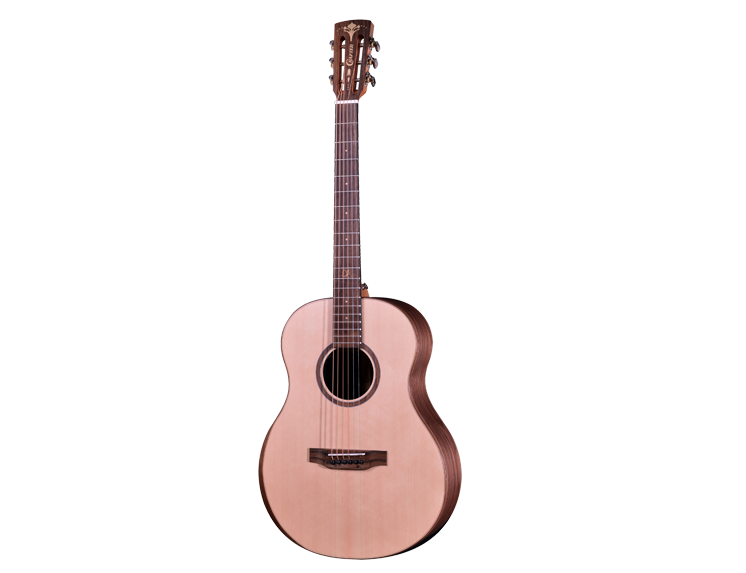The Grand Mind/Black Walnut boasts a Grand Auditorium body shape, offering a versatile sound suitable for various playing styles. Its Solid Spruce top combined with Black Walnut back and sides produces a balanced tone with warmth and clarity, making it ideal for both strumming and fingerpicking.