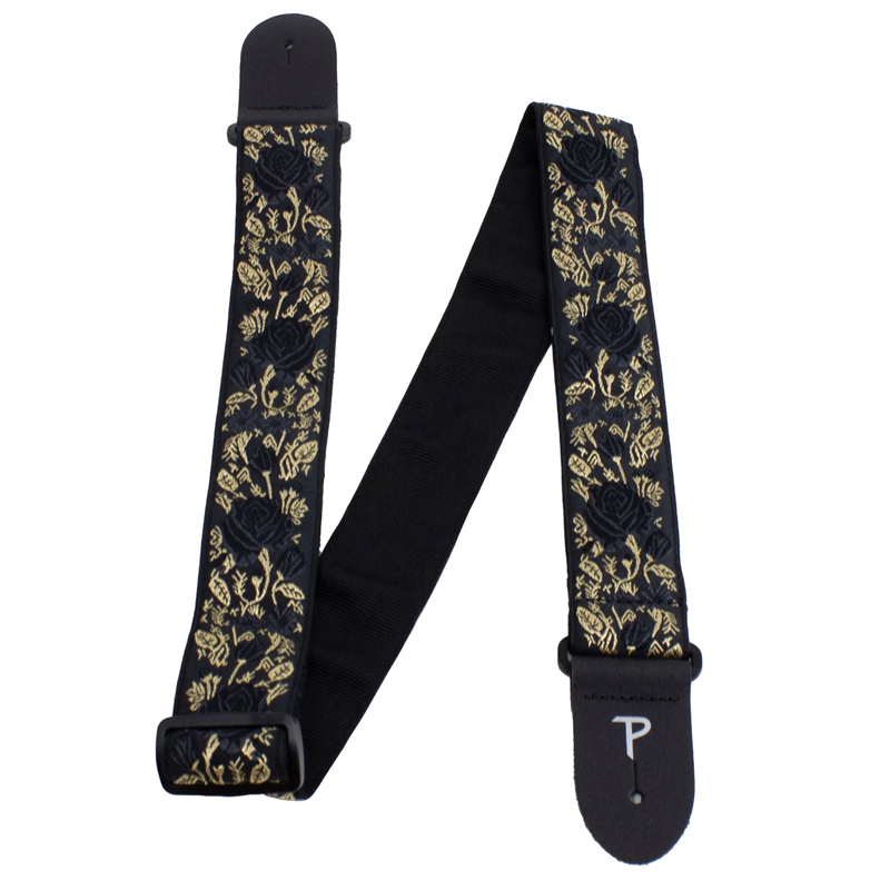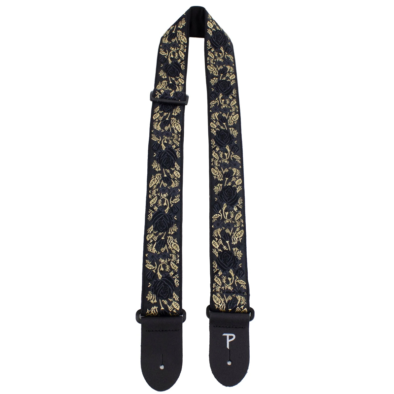 2 inch Black/Gold Roses On Black High Quality Jacquard Ribbon Sewn on Tubular Webbing with Leather Ends Adjustable length 39 to 58 SKU: TWS-7635