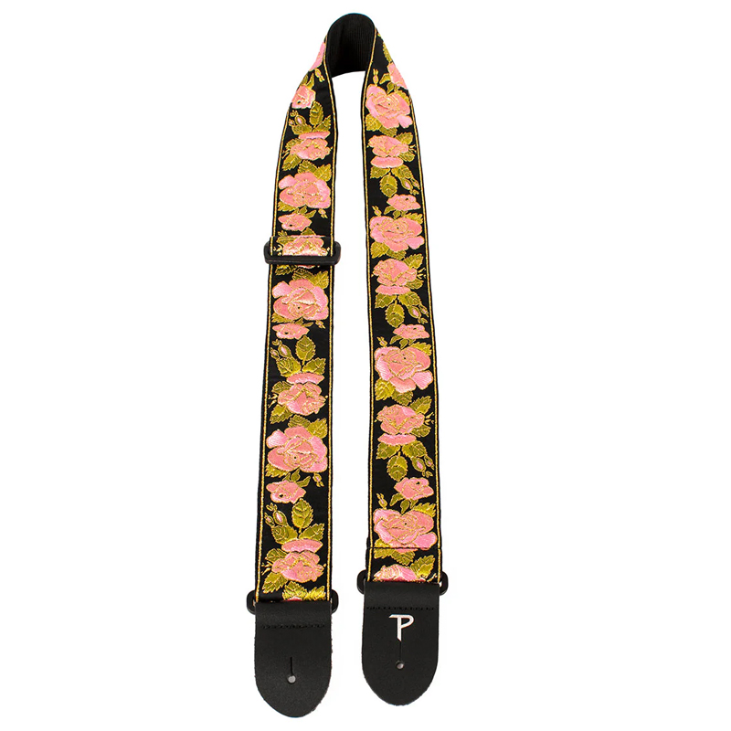 2 inch Pink and Black Flower Pattern High Quality Jacquard Ribbon Guitar Strap. Sewn on Tubular Webbing With Leather Ends.